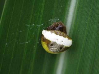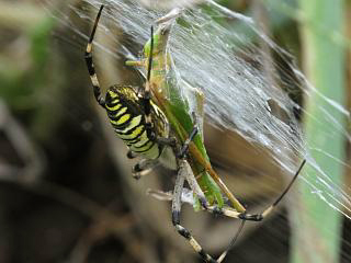 ショウリョウバッタを食べているナガコガネグモ(右)も発見。食べでがありそうや。