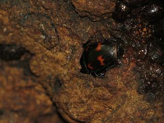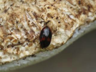 近くのキノコには小さなキノコムシ類(左)を発見。カタモンオオキノコムシとか?