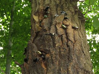 いろんな甲虫がごちゃっと集まっている樹(左)を見ている尾、