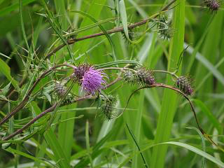 林縁には咲き始めのアザミ類(左)もありました。お名前調査中だけどわかるかなぁ。