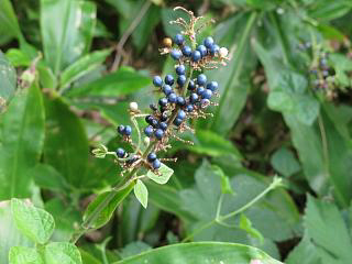 林縁を歩き回ると、ヤブミョウガの実(左)があったり、ご休憩中の