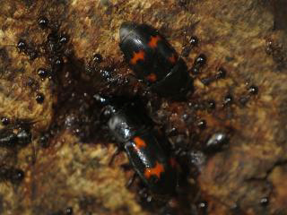 場所を変えると、樹液にヨツボシケシキスイ(左)が集まっていたリ、
