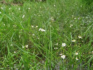 さらにじっくり歩いていくと、水田脇の水路にヘラオモダカがごちゃっとまとまっている場所を