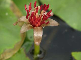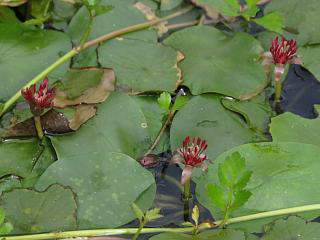 小さな池にはジュンサイ(左)が咲いていたので、花のドアップ(右)も撮ったり。