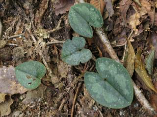 というわけで、とりあえず歩きはじめた山裾ではすぐにカンアオイ類(左)を発見。