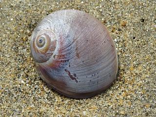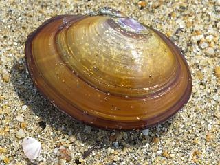 波打ち際にはイソシジミ?(左)が落ちてました。まだ生きてる感じかな?