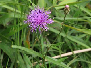 あたりには花盛りのヤマアザミ(右)も発見。さっきのも小株のヤマアザミかな?