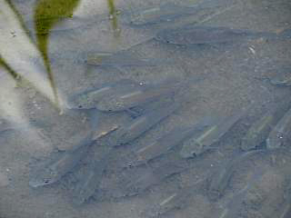 水中にごちゃっと小魚(右)が集まっているのを発見。これはフナ類かな?