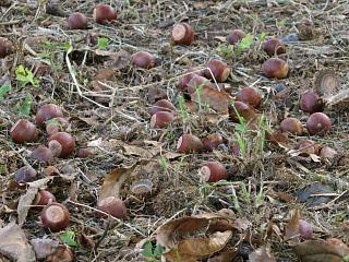 大量のコナラの実(左)が転がっているあたりを見ると。