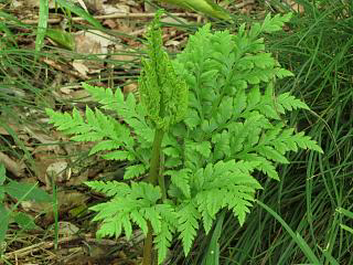 早くも胞子葉をあげているオオハナワラビ(右)南下も発見。