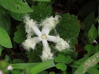 朝っぱらまで可愛く咲いていたんだろうな、というカラスウリの残り花(右)も見つかります。