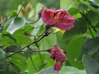 オオハマボウは、昨日咲き終わった濃いピンクの花(左)と、今ちょうど咲き始めた