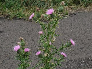 ごついけどちょっと淡い色のアザミ類(右)もありました。これもアメリカオニアザミかな?