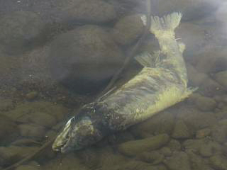 降りてみると、水中にサケ(右)の死骸を発見。そっか遡上時期なのか。