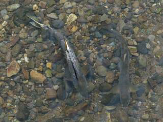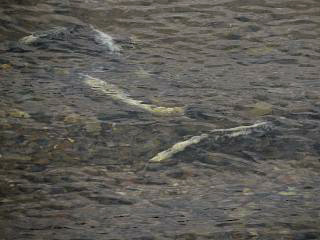 んで、橋の上から川面を見ると、そこここにサケの群れが登ってきていて