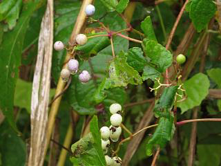 かなり歩いてから、ノブドウらしき実(左)をいくつか発見。