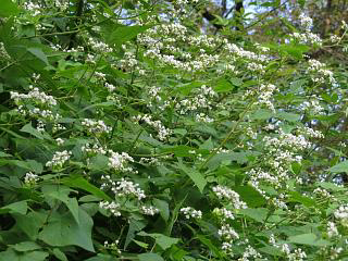 外をうろうろすると、こちらも大満開のシャクチリソバ(右)がお出迎え。