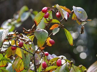 林の中では真っ赤な実をつけたサンシュユ(右)なんかにも会えたりします。