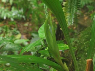 道端にあったレンギョウエビネ(左)を見ていると、小さな花芽(右)が1つ