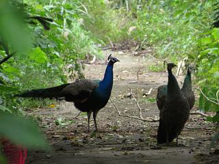 満足したので場所を変えようとすると、道端にインドクジャクの集会(左)を発見。