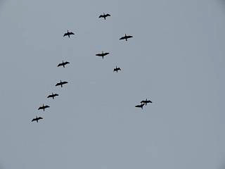 頭上を横切るカワウの群れ(左)なんか撮ったりしていると、