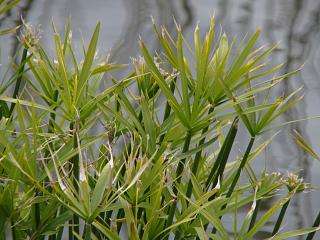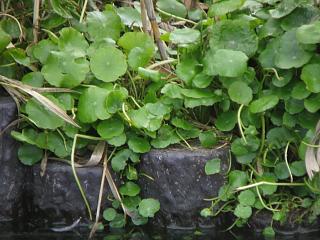 ふとよく見ると、池の中はブラジルチドメグサ?(左)とシュロガヤツリ(右)という