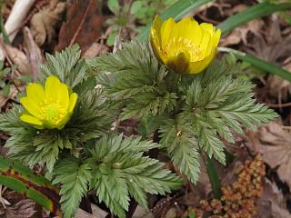 これまた可愛らしく咲いているフクジュソウ(左)を愛でつつ歩いていくと、